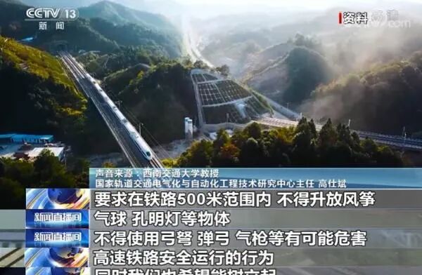 通俗来说,接触网就是给列车供电的电线,在正常情况下,电压能够达到25千伏。列车运行时一旦遇到轻飘异物,如孔明灯、锡箔纸、彩钢板、风筝等落在接触网上,就很可能影响到受电弓正常取电,导致突然停车。